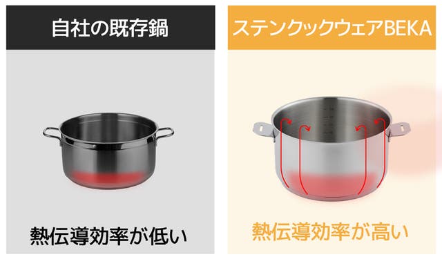 鍋は熱によって底が変形する場合がありますが、こうなると熱を均等に伝えることができず、美味しい料理を完成させるのが難しくなります。BEKAステンクックウェアはインパクト工法を活用し、IHやインダクションの熱い高出力でも底が変形しない丈夫なつくりにしました。