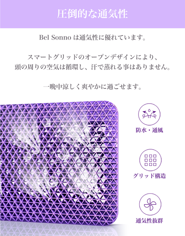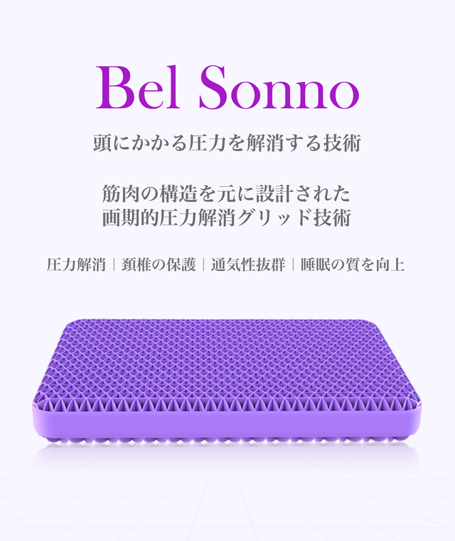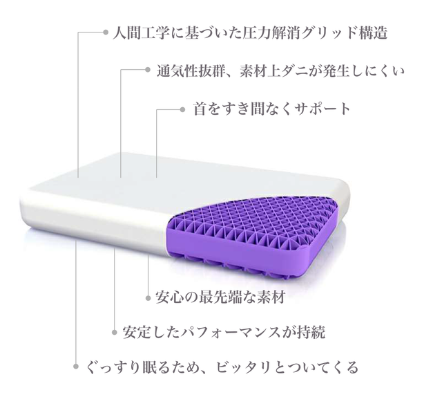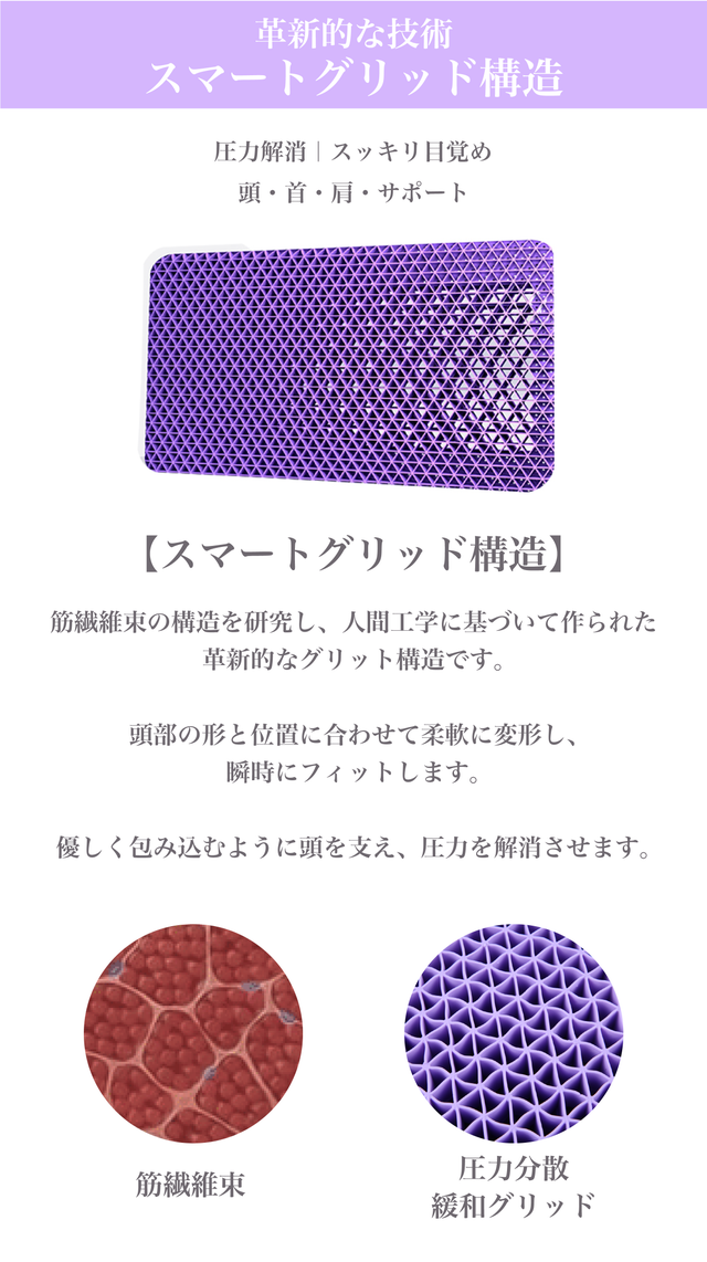 スマートグリッド(格子)構造の圧力解消枕。圧力が緩和されるため、寝起きが驚くほどスッキリ!3年の年月をかけて、独自に研究開発し、素材と構造に画期的な技術とデザインを施した商品です。