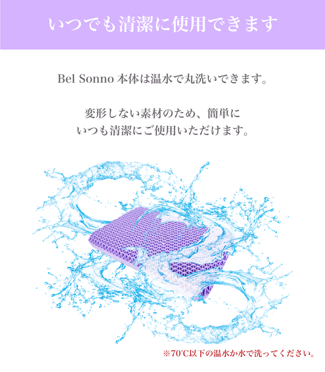 A. Bel Sonnoは70℃以下の温水または水で丸洗いできます。 直射日光の当たらない、風通しの良い場所で乾燥させてください。