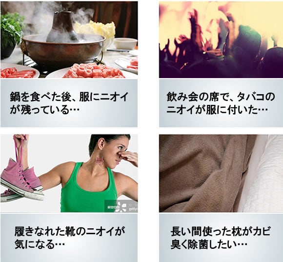上記のオゾン除菌の原理と同様に、ドラムに一定量の活性オゾンを注入することにより、空気中にもオゾンが拡散し、衣類等の臭気分子に作用し、付着した煙、鍋、動物の臭いなどの様々な臭気を除去します。