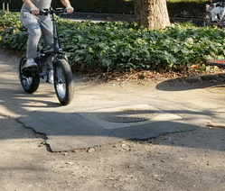 まず、雪道や砂地などのMTBだとタイヤの駆動力が出しづらい場所でも走れちゃいます。(*悪路は当然通常の道に比べ走りづらく時には滑る場合もございます。特にアイスバーンの路面での使用は急に止まれない可能性があります。スピードの出しすぎには十分注意されてください。)