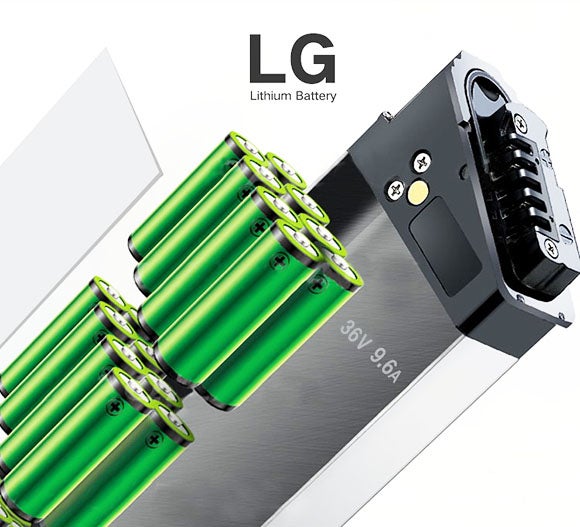 F160は電動アシスト自転車によくある「バッテリーが無くなるとペダルが非常に重くなる」という状態には一切なりません。バッテリーが切れても通常の自転車として使用可能!バッテリーはあのLG社の36V9.6Ahリチウムイオン電池を採用。