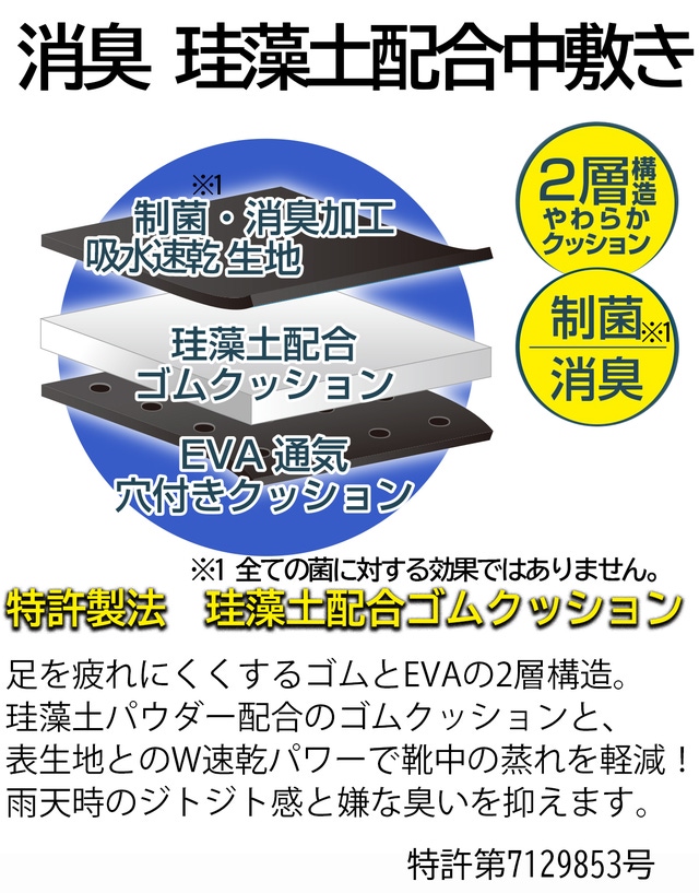 - 雨でも靴の中サラサラ!珪藻土配合ゴムクッション中敷装備。吸水速乾と消臭加工で蒸れや臭いを軽減