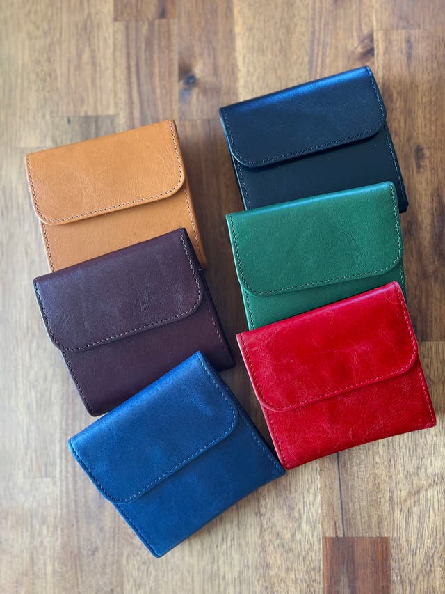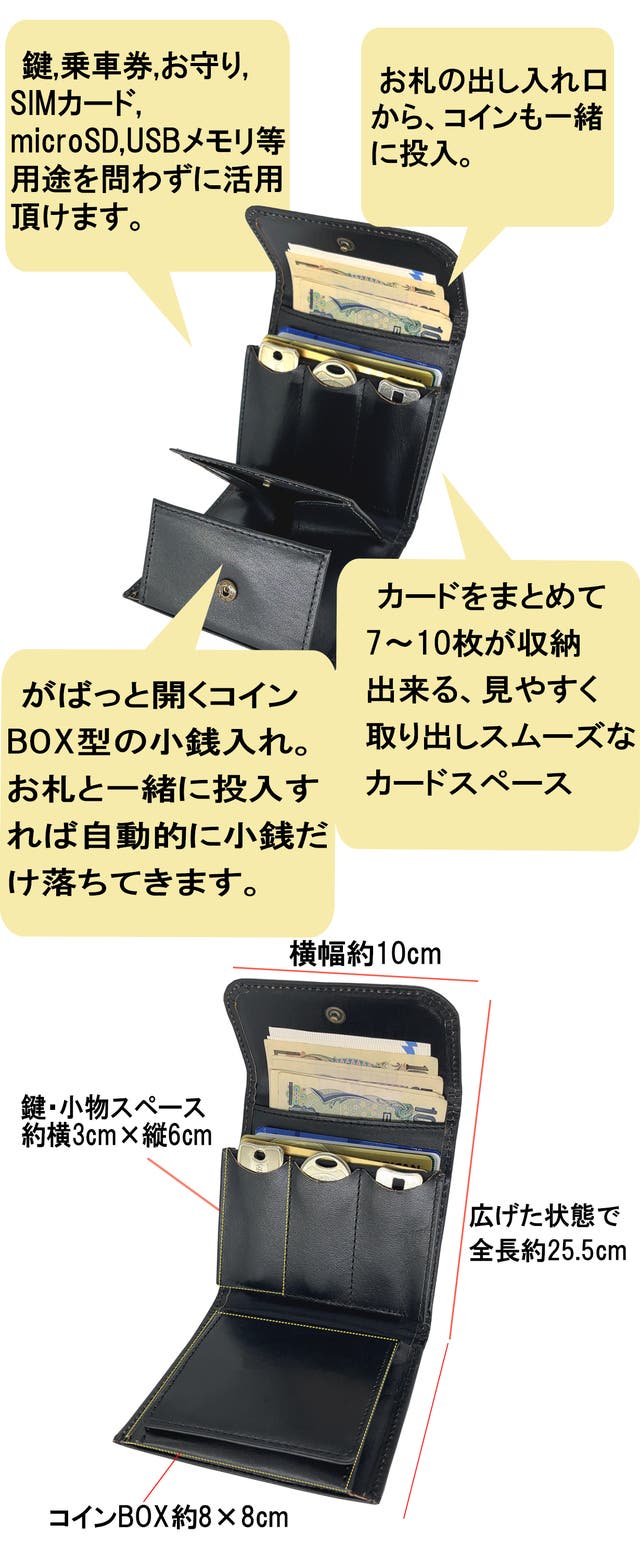 二つ折りのコンパクト財布は小銭入れが小さくて、使いにくいタイプも多いようです。BOX型で小銭が一目瞭然であること、出し入れが簡単でレジ前などでモタつかずスマートな所作に変えられるように、出来る限りの工夫を施しました。