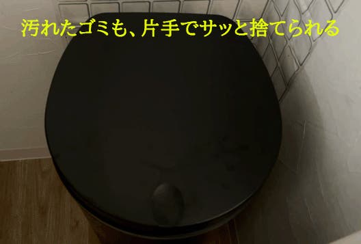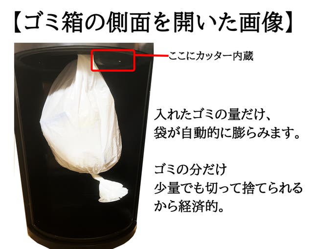 - 片手でワンタッチ開閉、電気一切不要。使った分だけ、ごみ袋を切って捨てられるから無駄がない。