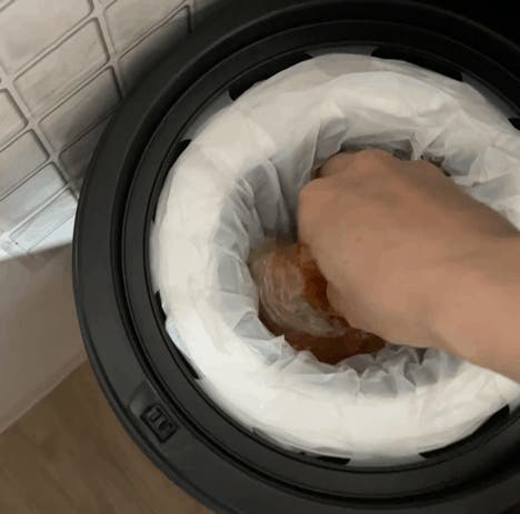 専用のごみ袋をセットして、袋の端を結び、ごみ箱の中へ入れるだけ。
