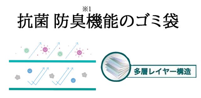 抗菌防臭(※1)機能付きのごみ袋は、入れたごみの量だけ自動で広がります。ビニール袋を好きな位置で切って捨てられるので、ごみ袋の無駄がありません。
