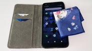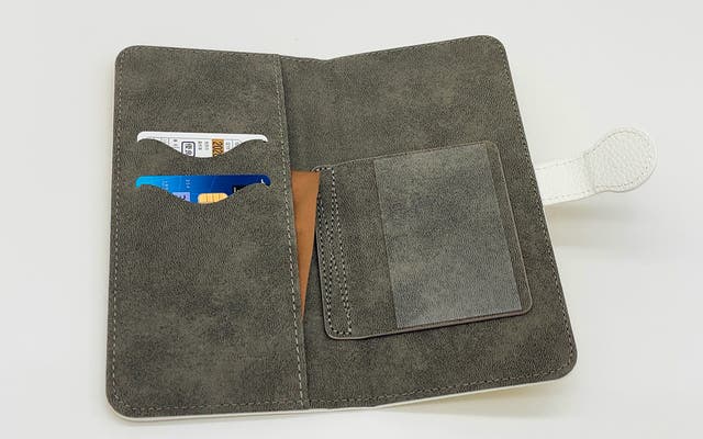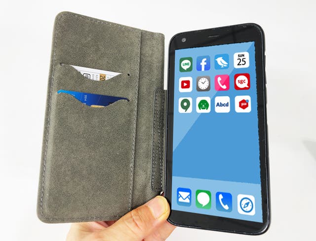 - 粘着シートで端末を固定し、カード収納が可能な人気の手帳型。様々なスマホに対応する2サイズ展開