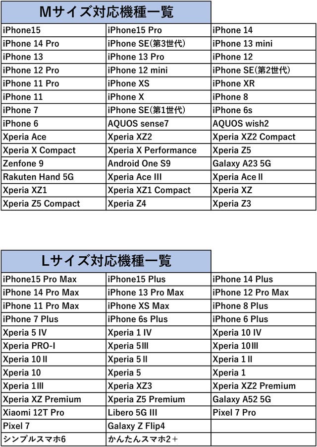 2柄展開、 LとMの2サイズ。スマートフォンは縦横(厚み1cm)が合えば、ほとんどのメーカー・機種に対応しております。(ページ下の対応表をご確認ください)