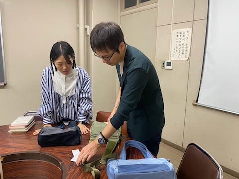 商品仕様について打ち合わせる日本女子大学 武本講師(左)とメーカーidiom担当