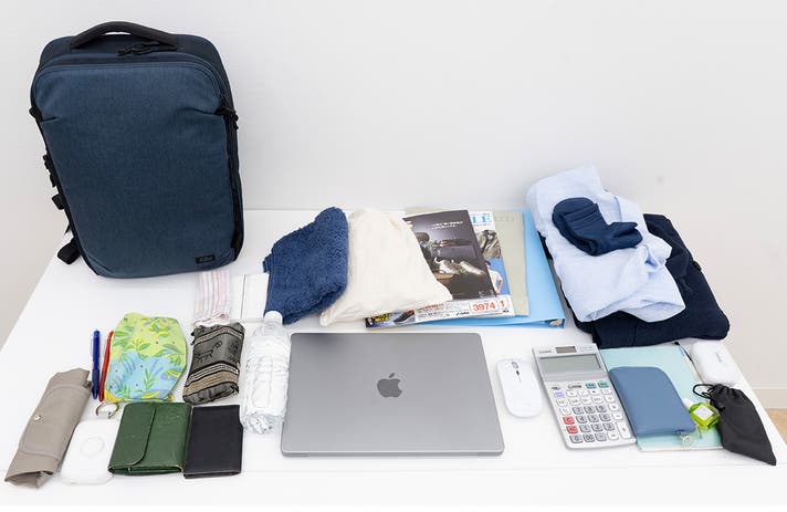 (PC・電卓・財布・カメラ・名刺入れ・ペットボトル・イヤホン・充電・ガジェット類・バッテリー・ファイル・雑誌・タオル・スキンケア用品・ペンケース・ポーチ・下着・靴下・シャツ・ジャケット)