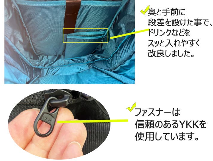 外側(横)のドリンクポケットは、ファスナーを開いて収納する仕組み。