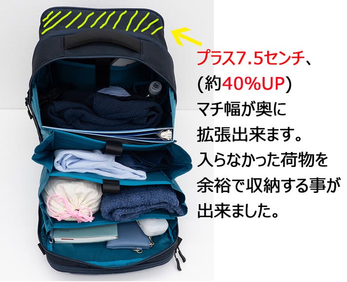 約40%収納力アップ!拡張して奥行を拡げることで、入りきらなかった荷物を整えつつ収納できるようになりました。