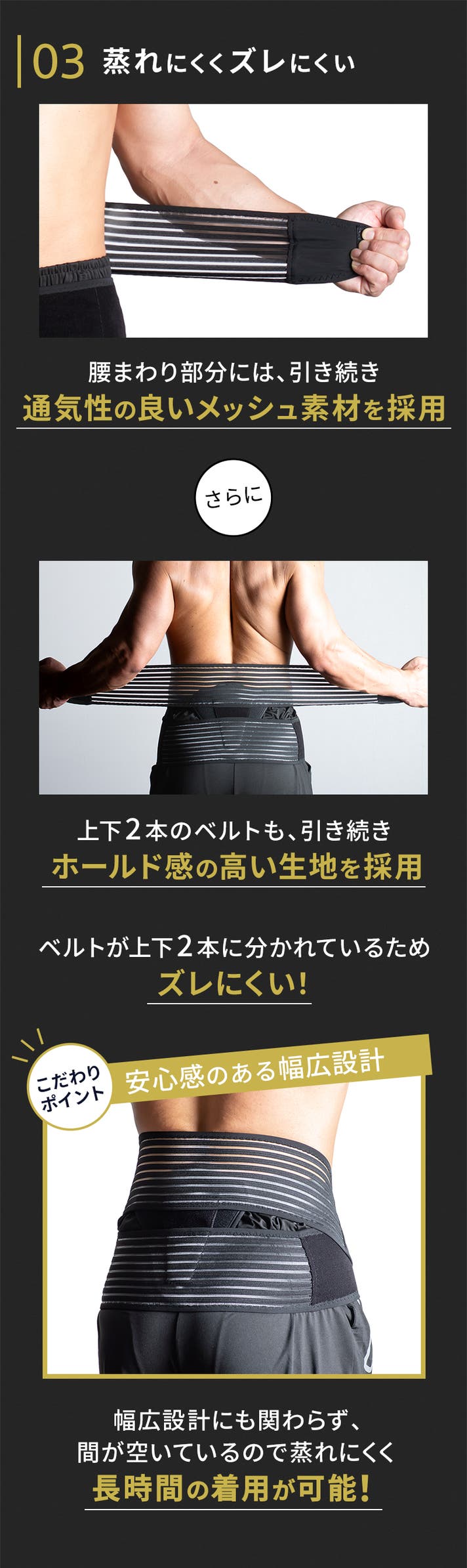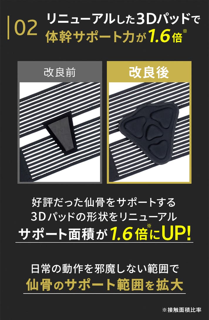 - 2本のベルトで腰の負担を軽減!改良された立体的な3Dパッドで体幹のサポート力が1.6倍※にUP