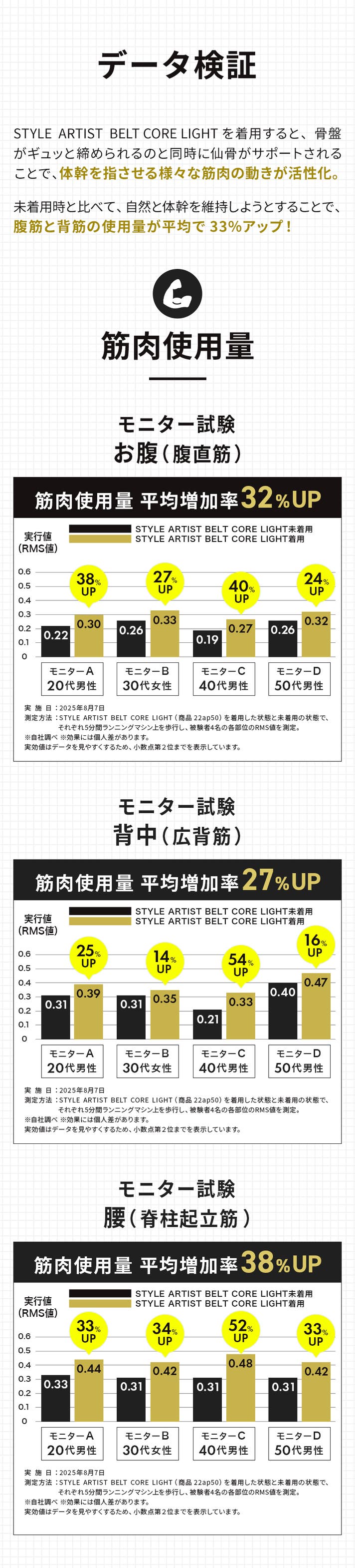 - 着用中の腹筋と背筋の使用量がUP!お腹を締め付けずにインナーマッスルの働きをアシスト