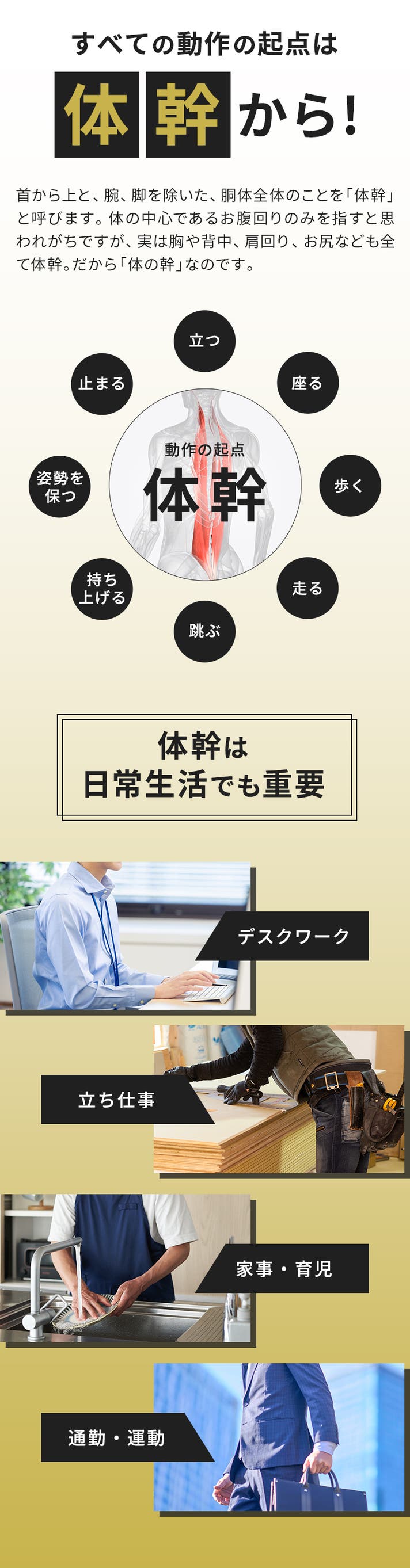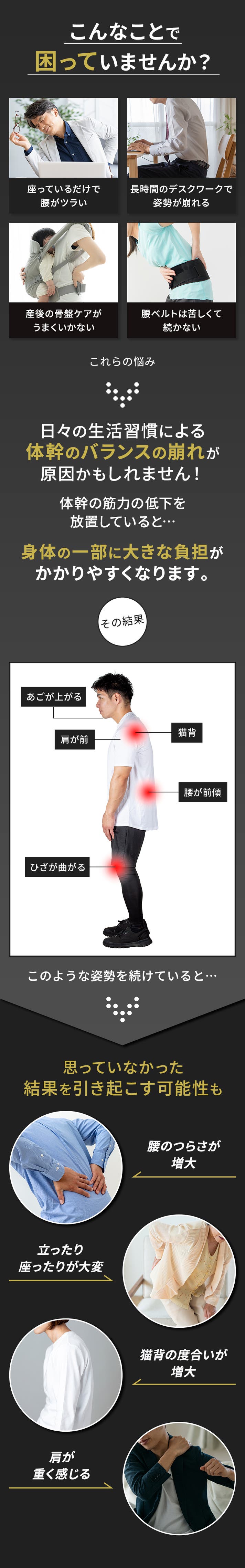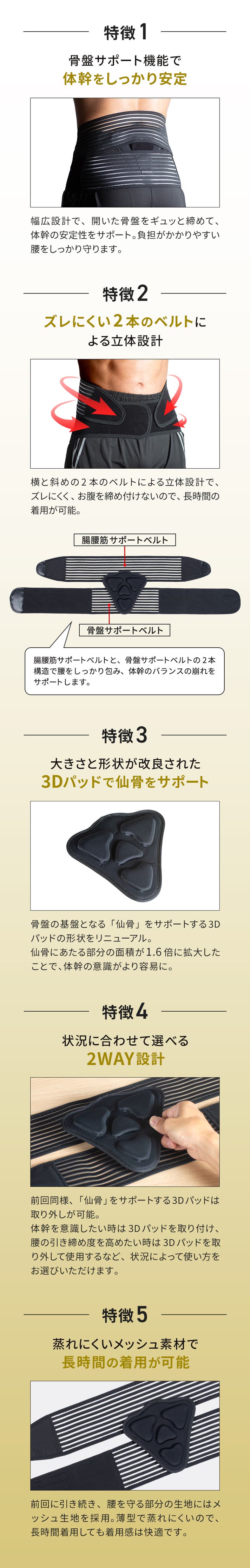 - 腰と体幹の悩みに同時にアプローチ!2WAY設計で体幹の安定性をしっかりサポート!