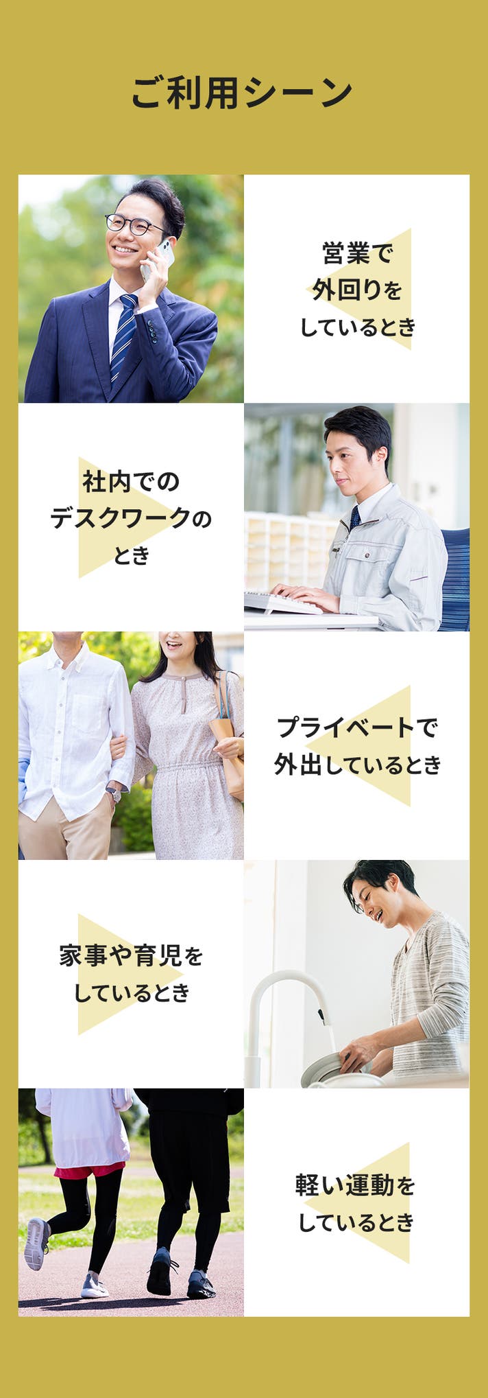 A.仕事中や自宅での炊事・洗濯のときはもちろん、通学中や通勤中、お買い物中や軽い運動をする際に着用してください。