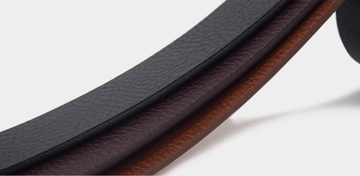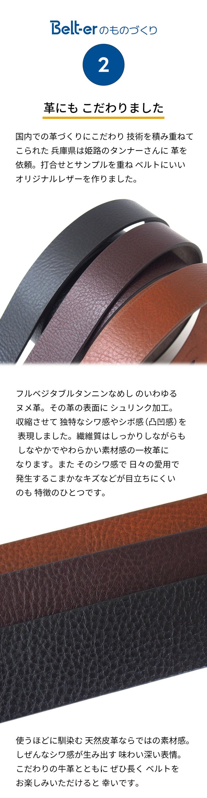 約3.5cm幅 いろいろなコーディネートにあわせやすく 革のアクセントをプラスできる 牛革ベルトです。とはいえ 長くベルトづくりに携わってきた Belt-er ですから。細かい部分にもこだわりました。