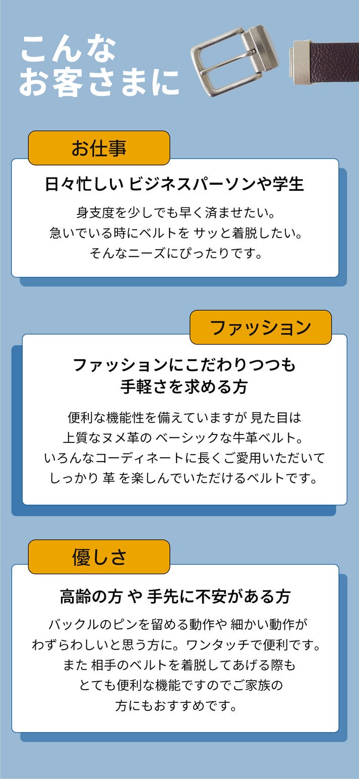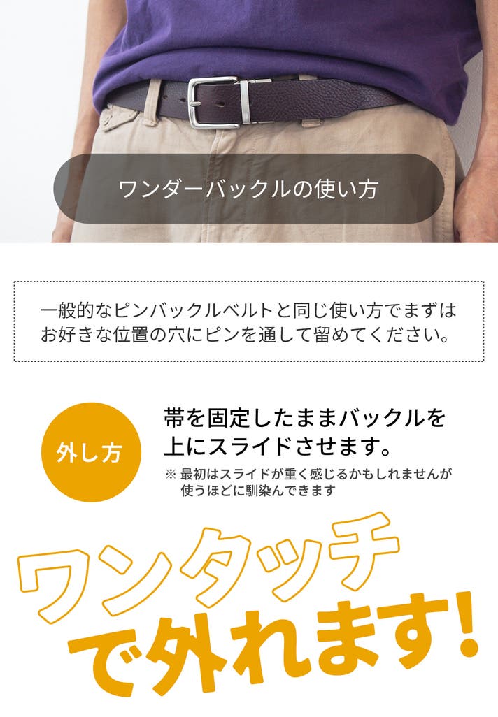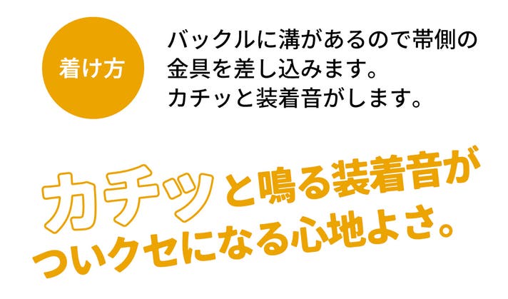 - 『 ワンタッチで着脱 』バックルそのままに かんたん動作で着けたり外したりできる便利なベルト。