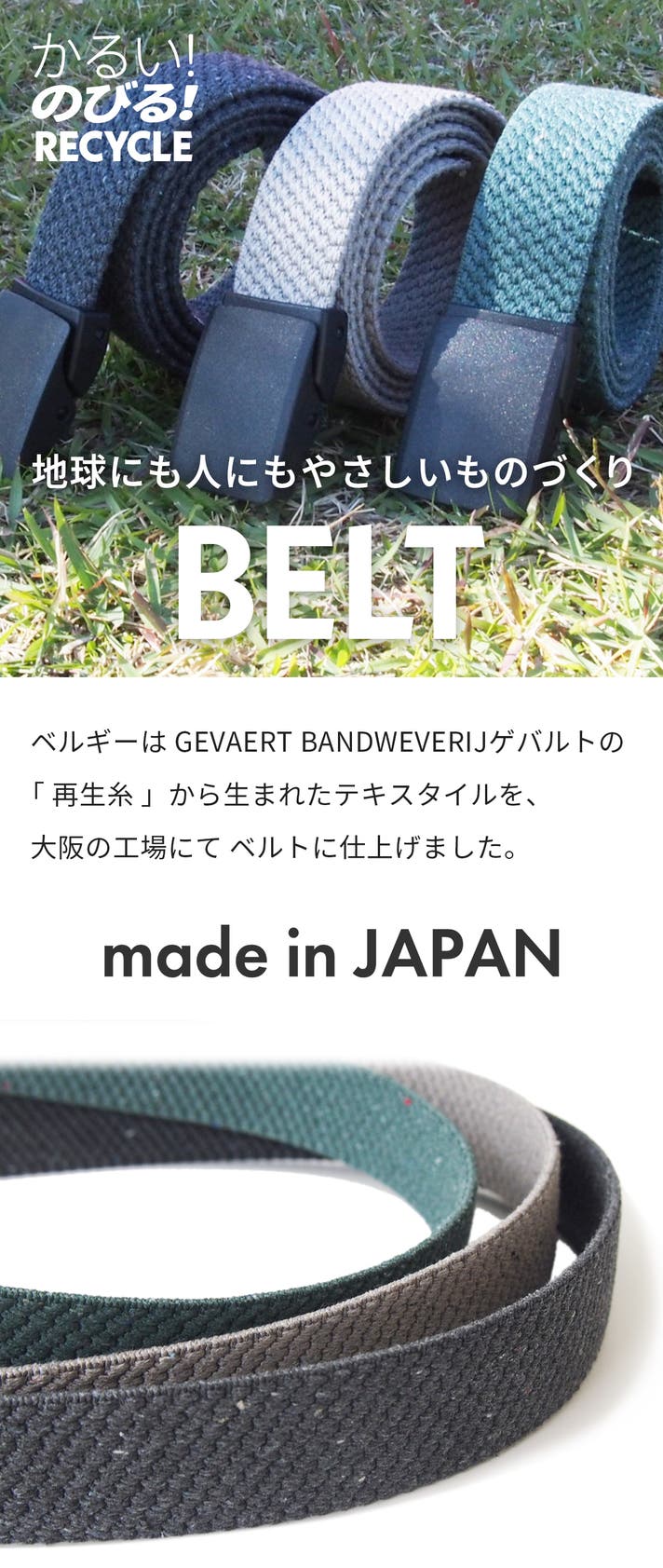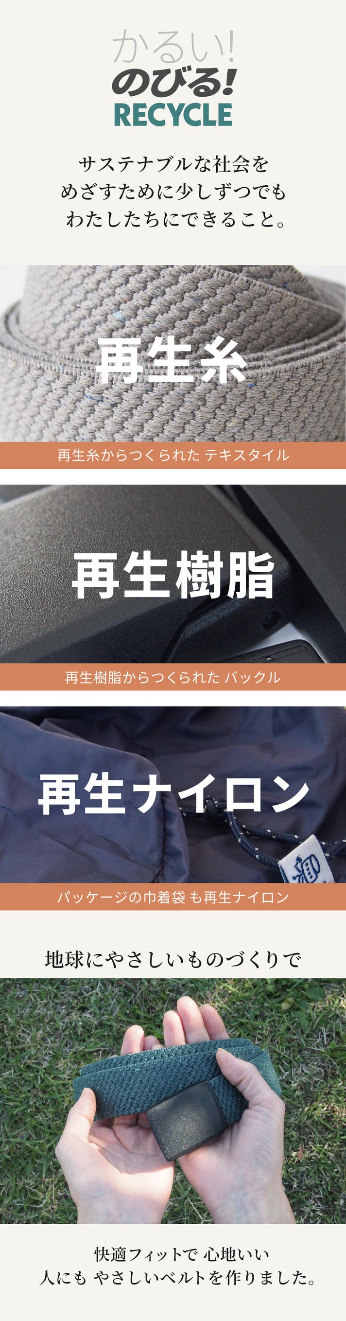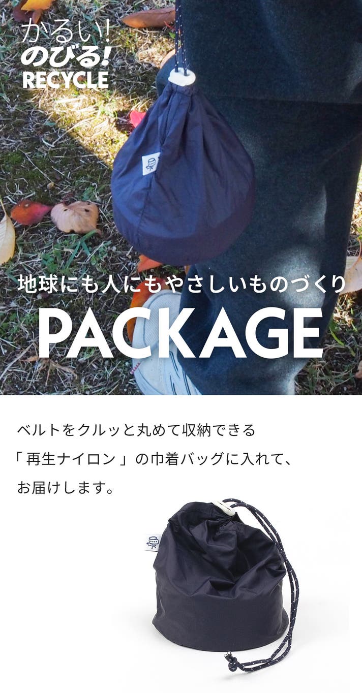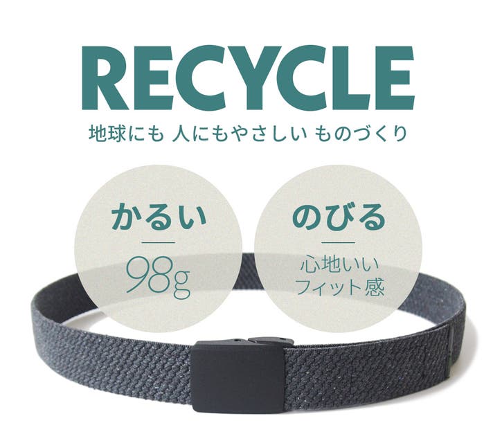- 地球に優しい、サステナブルな再生素材で、快適なゴムベルトを作りました。