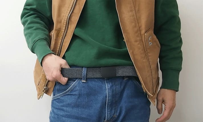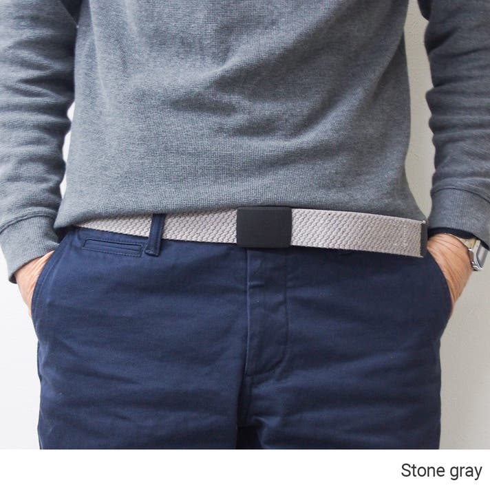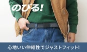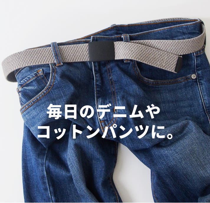 リサイクルデニム糸を編みこみ 伸縮性のあるゴム素材を配合した、約3.5cm幅の生地テープ。しっかりした厚みで、へたりのない しなやかな生地感。心地いい伸縮性で、腰に沿ってジャストフィット。とにかく軽くて、動きやすいベルトです。
