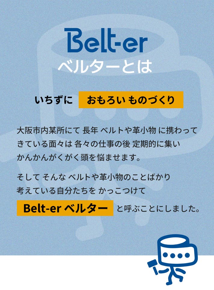 大阪市内某所 にて、長年 ベルトや革小物 に携わってきている面々は 各々の仕事の後、定期的に集い かんかんがくがく頭を悩ませます。そして、そんな ベルトや革小物のことばかり考えている自分たちを、かっこつけて Belt-er ベルター と呼ぶことにしました。ひたむきに長年つちかってきた、技術やアイデア。そこに 思いもつめこんだ、自分たち自身もワクワクする「 おもろい ものづくり 」。商品を手にしていただいたときに、その「 おもろい ものづくり 」を お客様にも感じていただけたら。そんな商品を Belt-er ベルター は 考えていきたいと思っています。