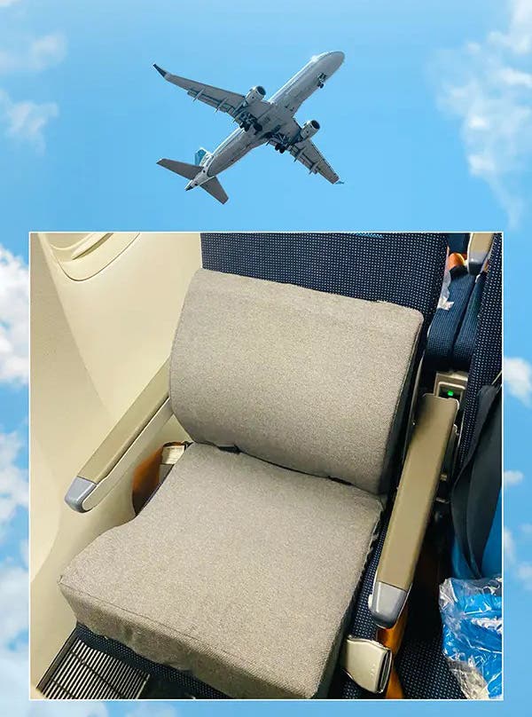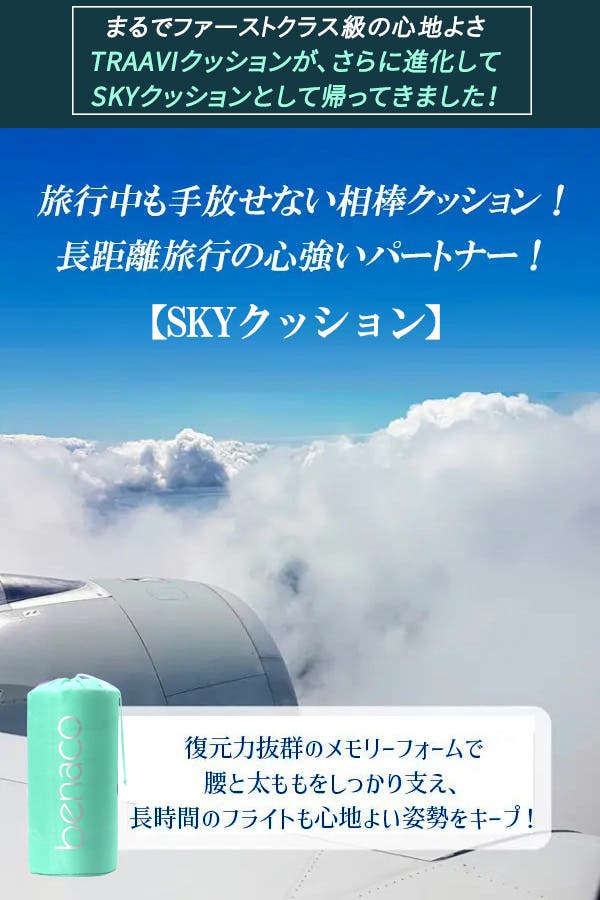 長時間のフライトでも、脚のしびれや腰のつらさを軽減!ファーストクラスのような快適さ、もう夢じゃありません。そんなお悩みを解決するのが、SKYクッションです!
