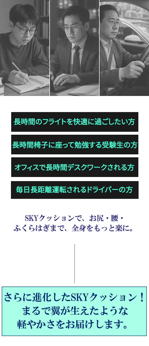 SKYクッションで、お尻・腰・ふくらはぎまで、全身をもっと楽に。