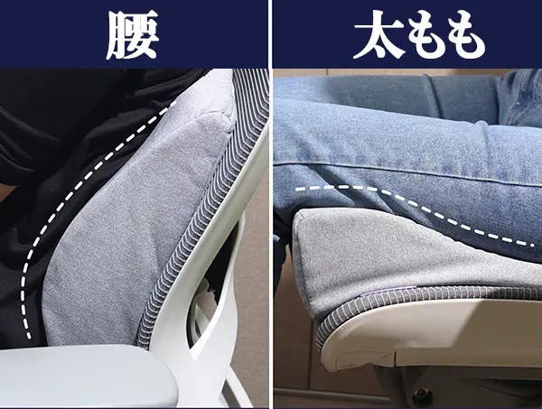 - 腰と太ももをしっかりホールドし正しい姿勢をサポート。長時間のデスクワークも快適に過ごせます。
