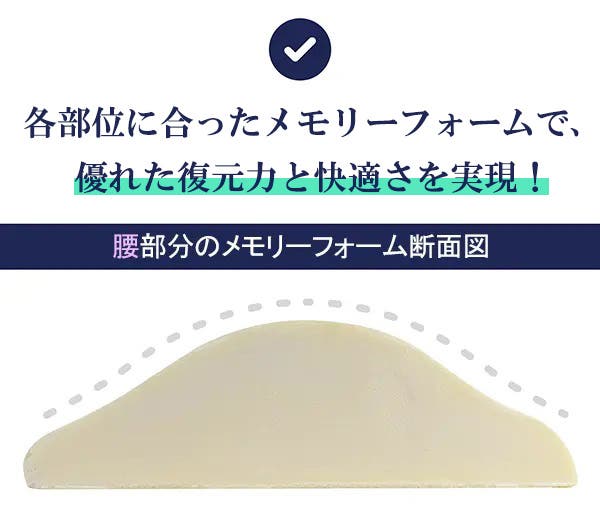 腰と太もも、それぞれの特性に合った2段階構造のECOメモリーフォームを採用。それぞれの部位に最適なメモリーフォームを適用してこそ、抜群の快適さを体感できます。しかも、優れた復元力で、ふかふかで快適な座り心地を長くキープします。