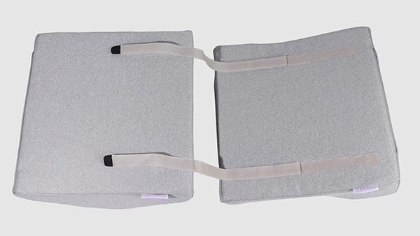 SKYクッションは、腰と太ももをそれぞれしっかり支えるために、2つのパーツで構成されています。クッションの底面にある面ファスナーで長さを調節できるのはもちろん、クッションを分離して別々に使用することもできます。特製の面ファスナーが付いていることで、飛行機の座席はもちろん、新幹線や汽車、高速バス、車の座席にもズレを気にせず安定した座り心地です。