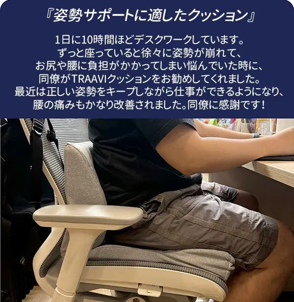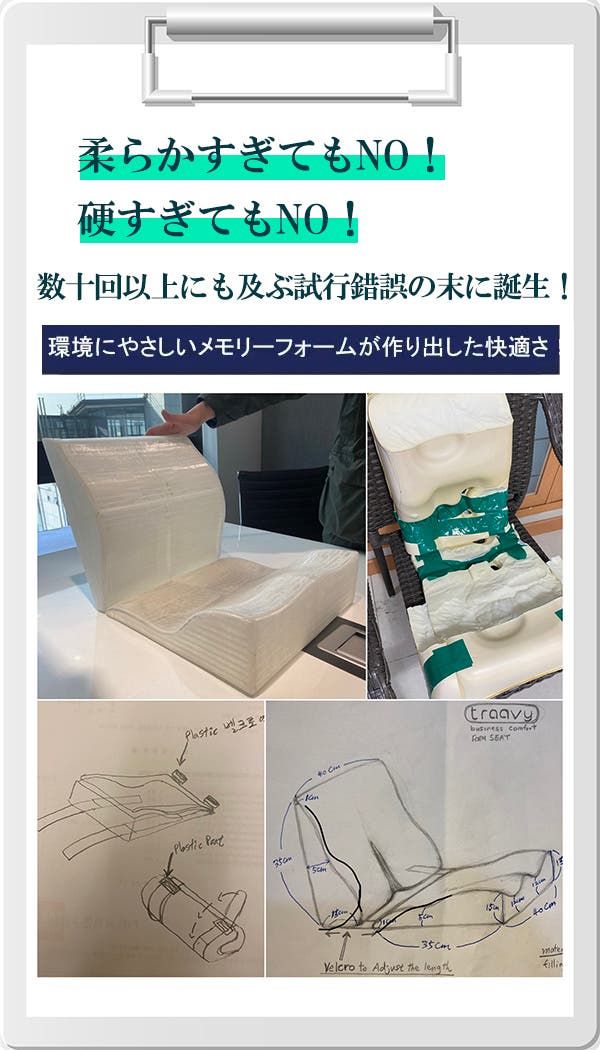 そんな強い思いから、出張のたびに様々なクッションを試し続け、試行錯誤を重ねた末に、ついに自身の体で効果を実感できるサンプルを開発するに至りました。
