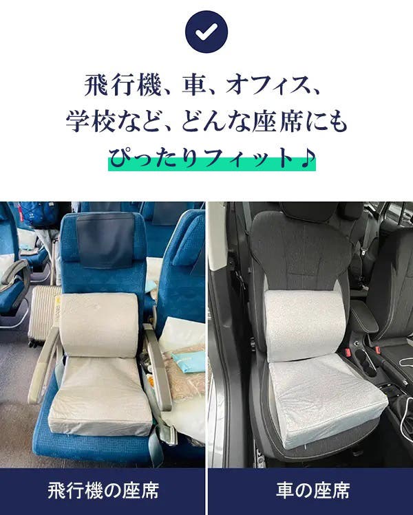 飛行機の座席に!フリーサイズで、どんな座席にもしっかりフィットします。車のシートにも!どんな座席にも合うサイズで長距離移動のお供のクッションとしても大活躍します。