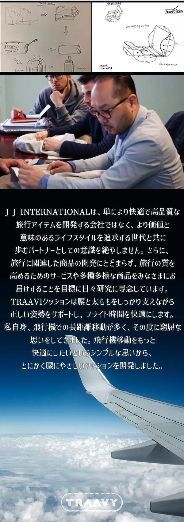 Makuakeの皆様、こんにちは!昨年TRAAVIクッションをご紹介させていただいたJJインターナショナルです。JJインターナショナルは、ただ快適で高品質な旅行グッズを開発するだけでなく、より価値のあるライフスタイルを追求する世代と共に歩む“パートナー”であり続けることを目標にしています。長時間のフライトや旅行はもちろん、オフィスやご自宅、車内など、日常生活の中でも気軽にお使いいただける『SKYクッション』の安楽さを、ぜひ直接ご体験ください!