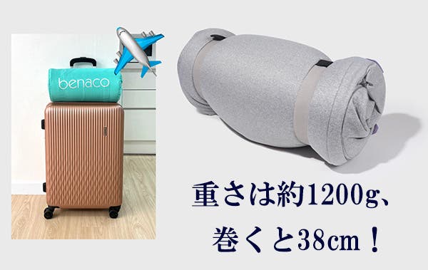 キャリアケースの上にぴったり乗るサイズに変身♪ 重さは約1200g、くるっと丸めれば、スーツケースに中にスッキリ収まるコンパクトサイズ!スーツケースの上に乗せて持ち運びましょう。