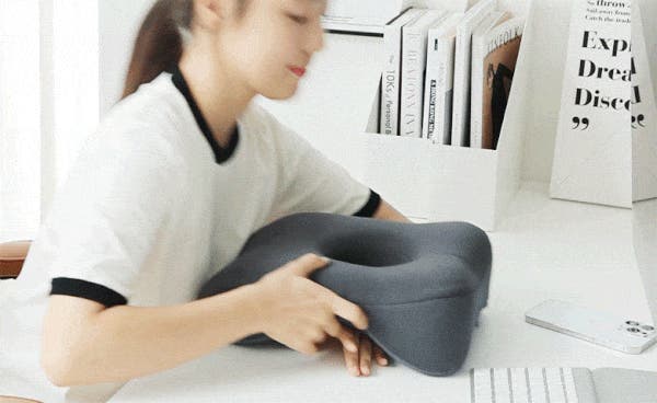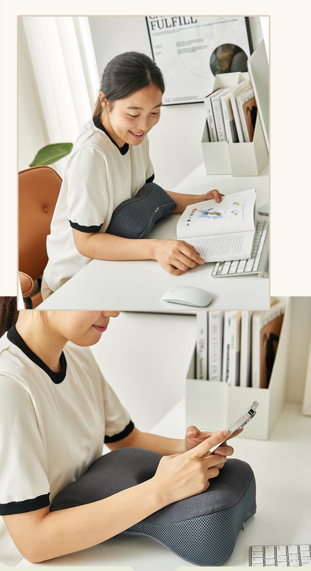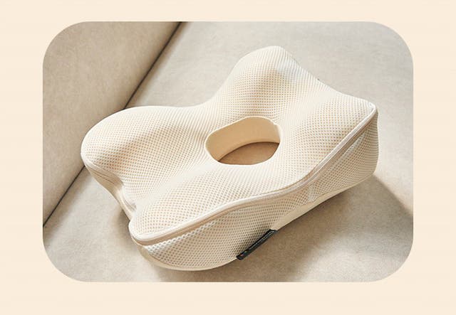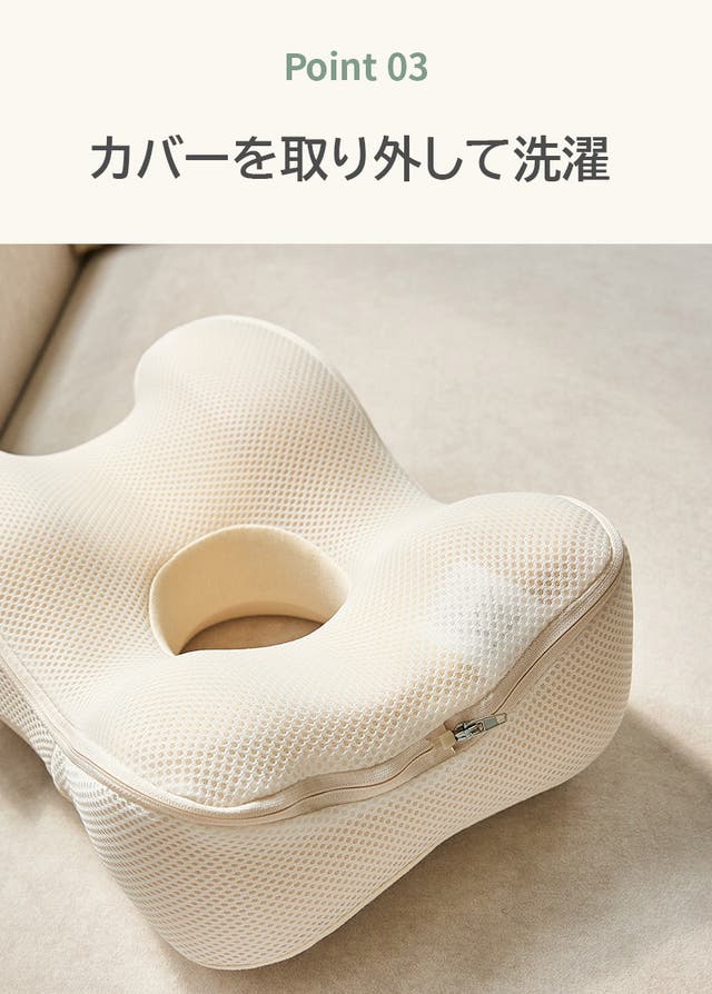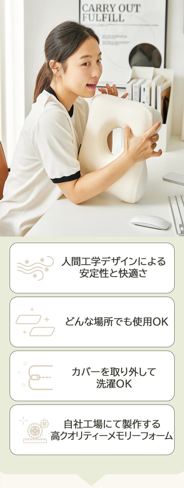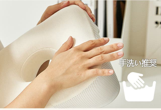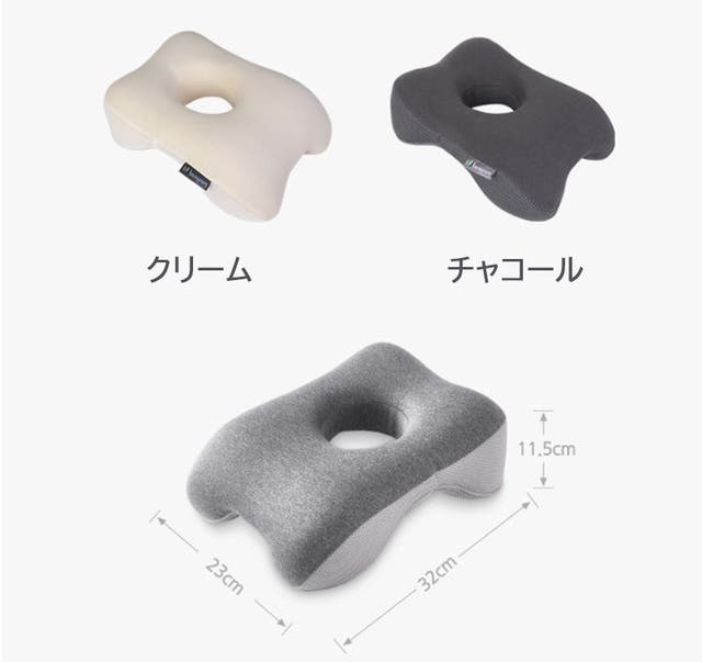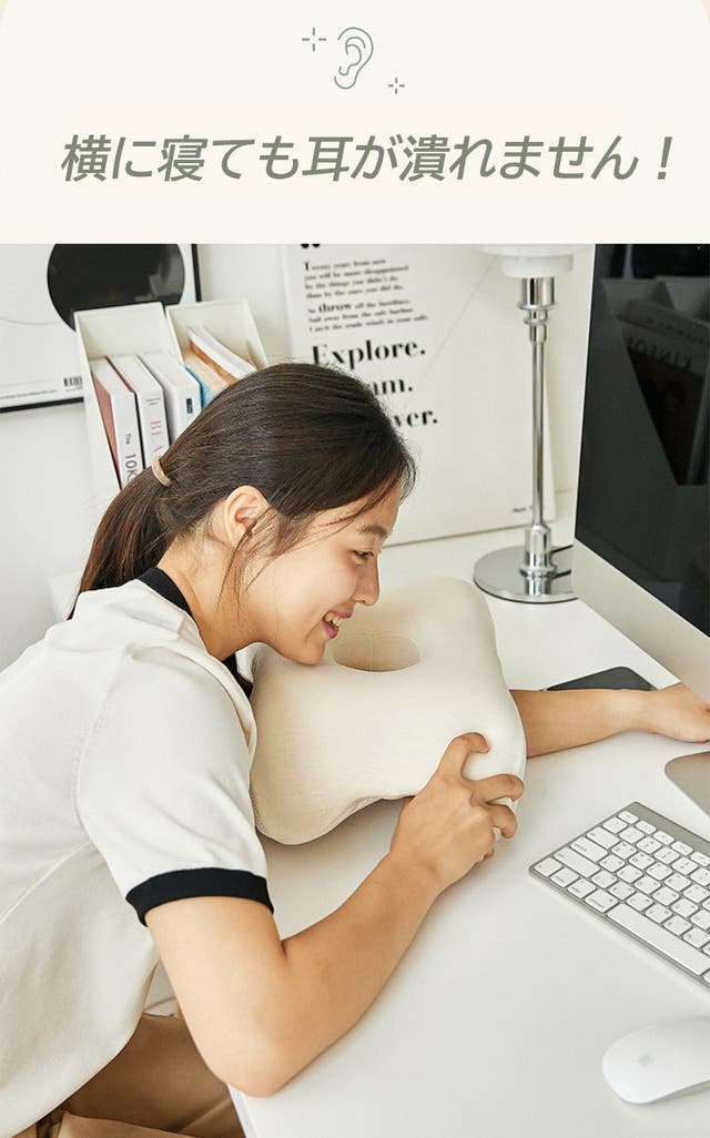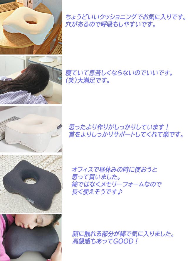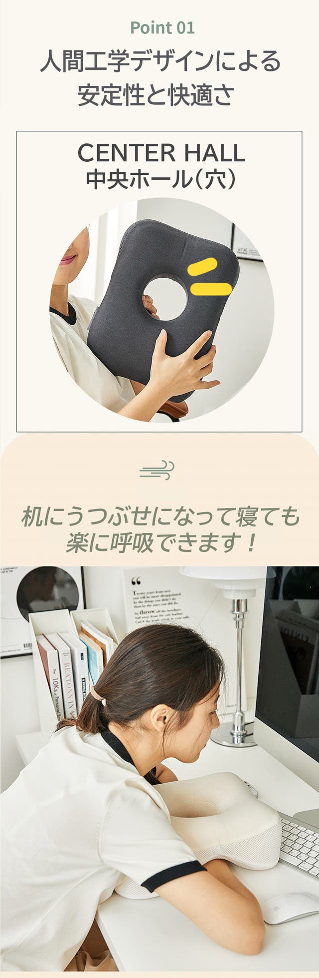 - 中央ホール(穴)があって、机にうつぶせになって寝ても楽に呼吸でき、横に寝ても耳が潰れません!