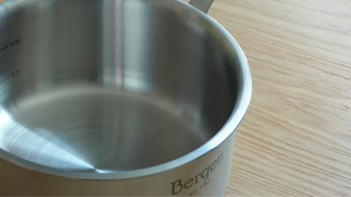 Bergenで採用されるSUS304( Steel Use Stainless)は、とてもサビが出にくい金属です。これは成分中に含まれるニッケルのおかげです。多少の傷は目立たず腐食もしにくいため、保管も簡単です。更にSUS430( Steel Use Stainless)の熱処理によって強度を向上させています。ミニサイズの鍋ながらズッシリしています。