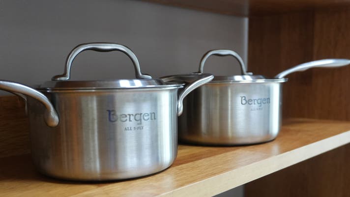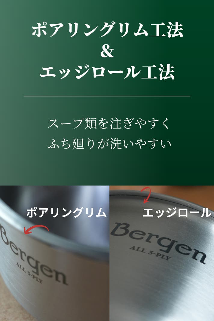 Bergenは見た目は小さく「器の大きい」片手鍋です。炊く、煮る、焼くまでこなす本格的5層ステンレス調理器具です。