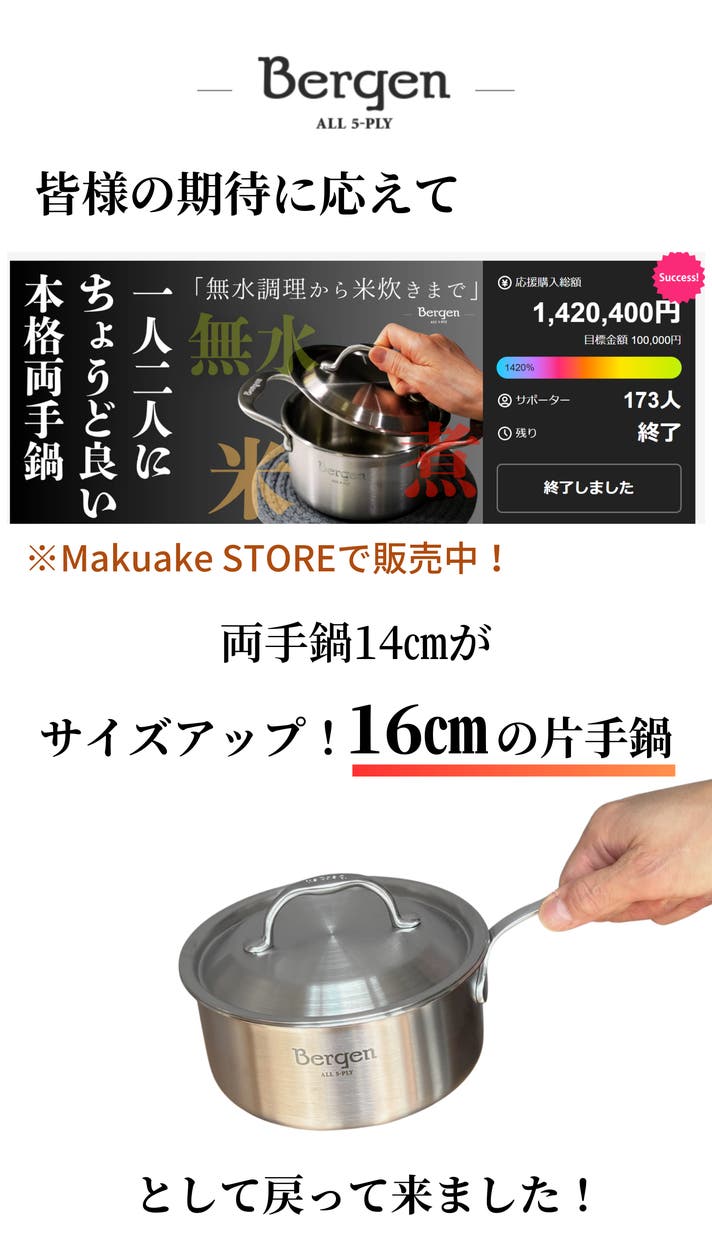 「Makuake(マクアケ)」は、実行者の想いを応援購入によって実現するアタラシイものやサービスのプラットフォームです。このページは、 プロダクトカテゴリの 「Bergen 第2弾も無水調理から本格料理まで!5層ステンレス 片手鍋16cm」プロジェクト詳細ページです。