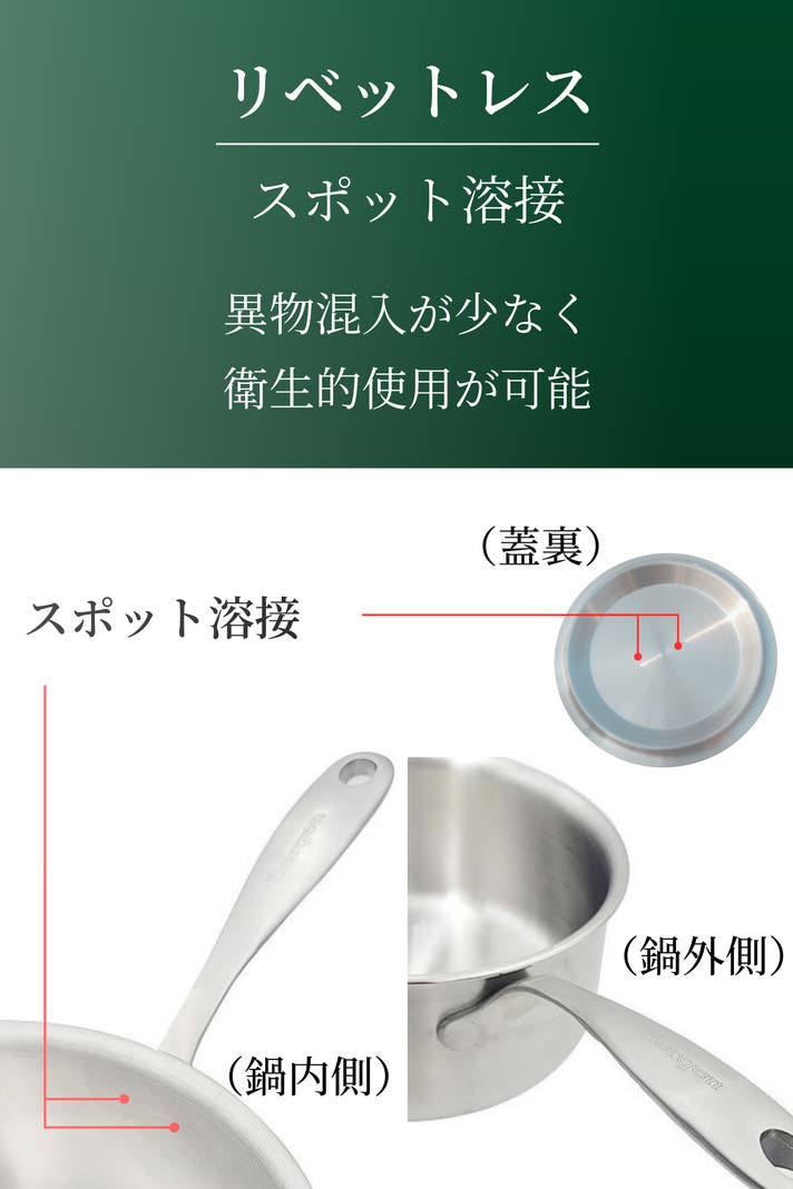 Bergenの鍋持ち手と蓋持ち手部分にはリベットがなく溶接処理されているため、いつもキレイで洗いも簡単です。