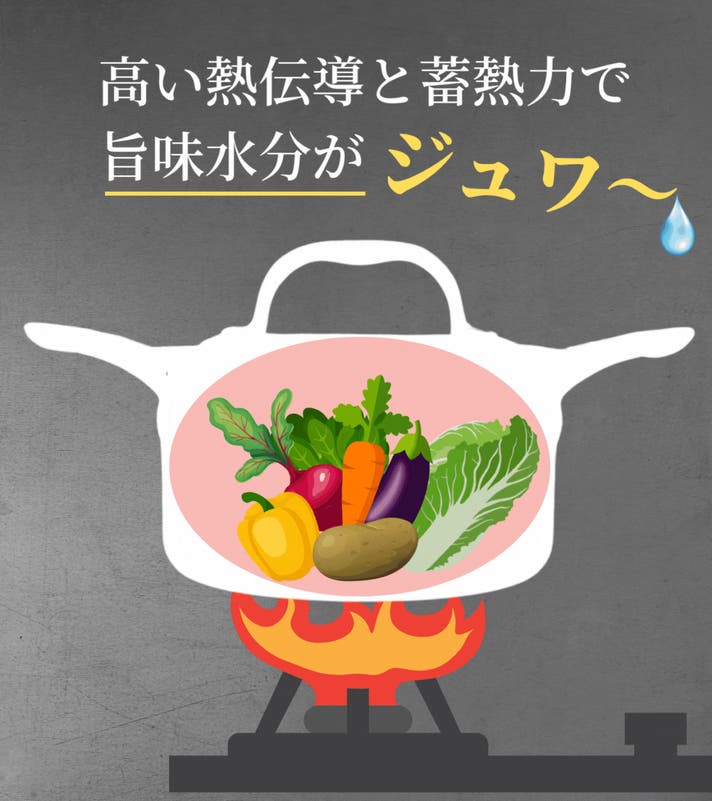 ステンレス鍋はガンガン強火で使用するものではなく蓄熱力でじわじわ調理していくものなのです。熱効率のよい時短料理や長く温かい予熱料理が可能です。