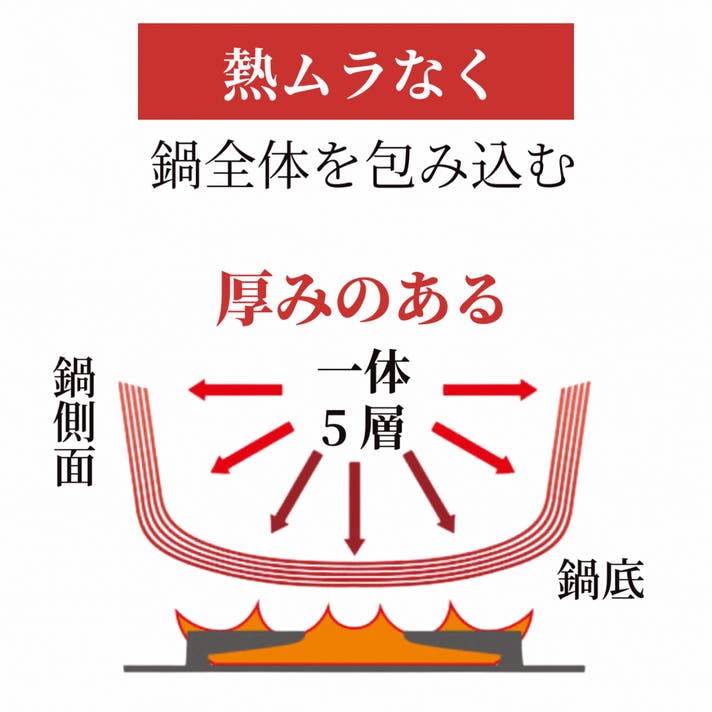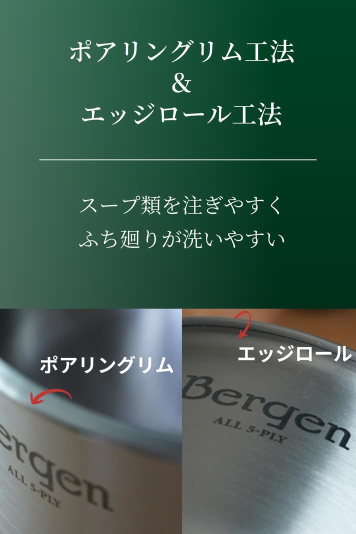 Bergen5層ステンレスは鍋全体を丸っと包み込む構造です。一度温まるとじっくり蓄熱し保温性があるのでなかなか熱を逃がしません。