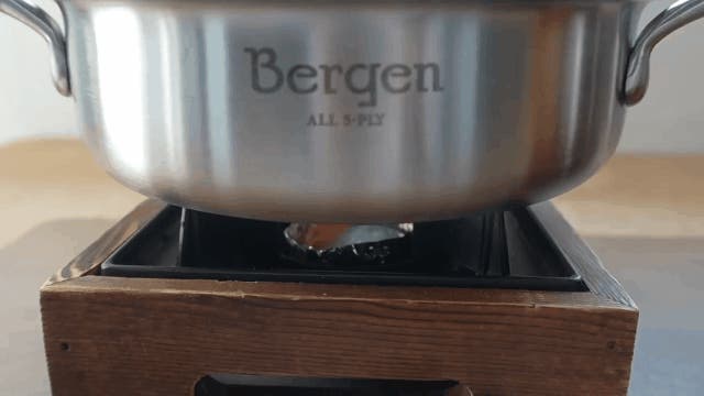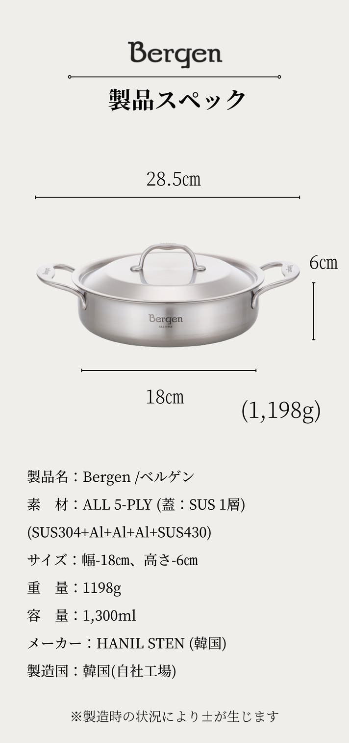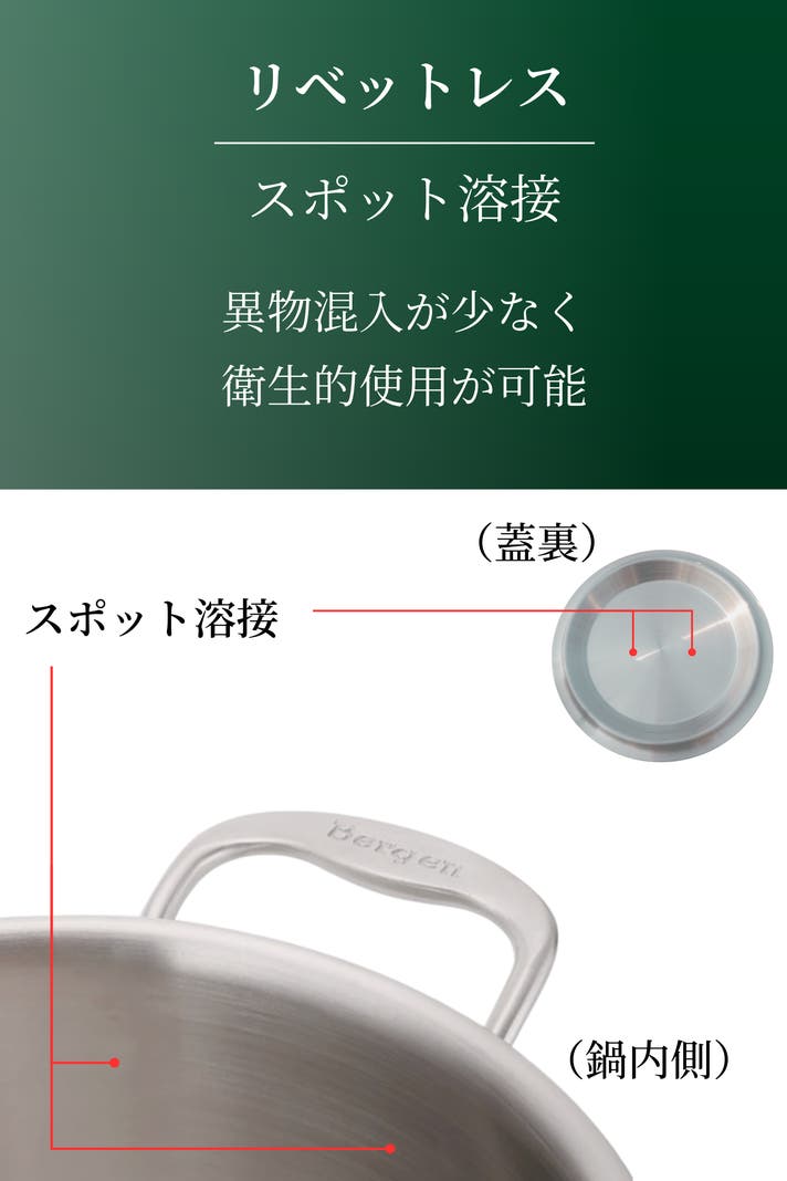 Bergenで採用されるSUS304( Steel Use Stainless)は、とてもサビが出にくい金属です。これは成分中に含まれるニッケルのおかげです。多少の傷は目立たず腐食もしにくいため保管が簡単です。更にSUS430( Steel Use Stainless)の熱処理によって強度を向上させています。ミニサイズの鍋ながらズッシリしています。