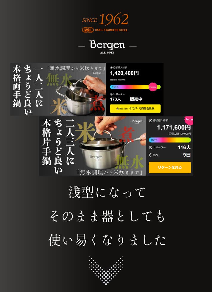 「Makuake(マクアケ)」は、実行者の想いを応援購入によって実現するアタラシイものやサービスのプラットフォームです。このページは、 プロダクトカテゴリの 「「ひとりふたりの鍋ごはん」Bergenは調理道具を超える!食卓に一皿の贅沢」プロジェクト詳細ページです。