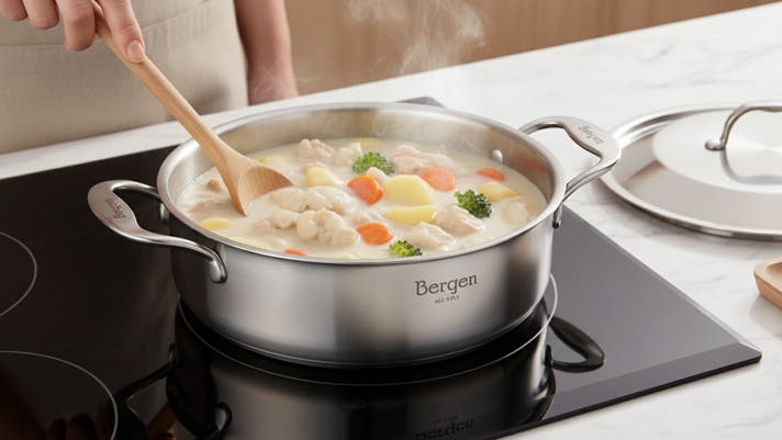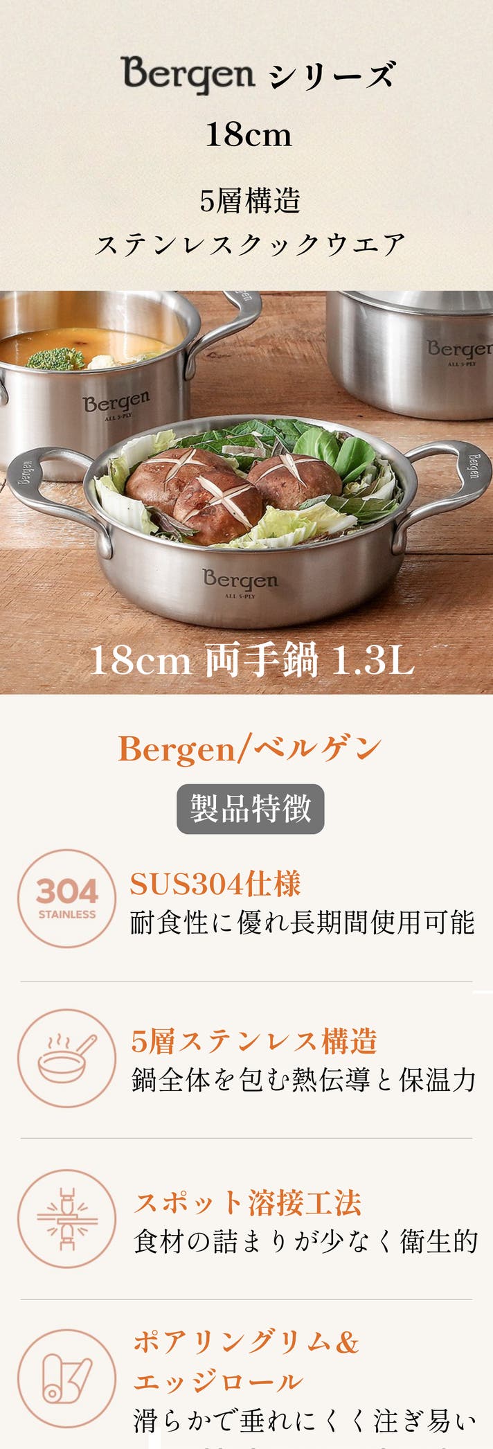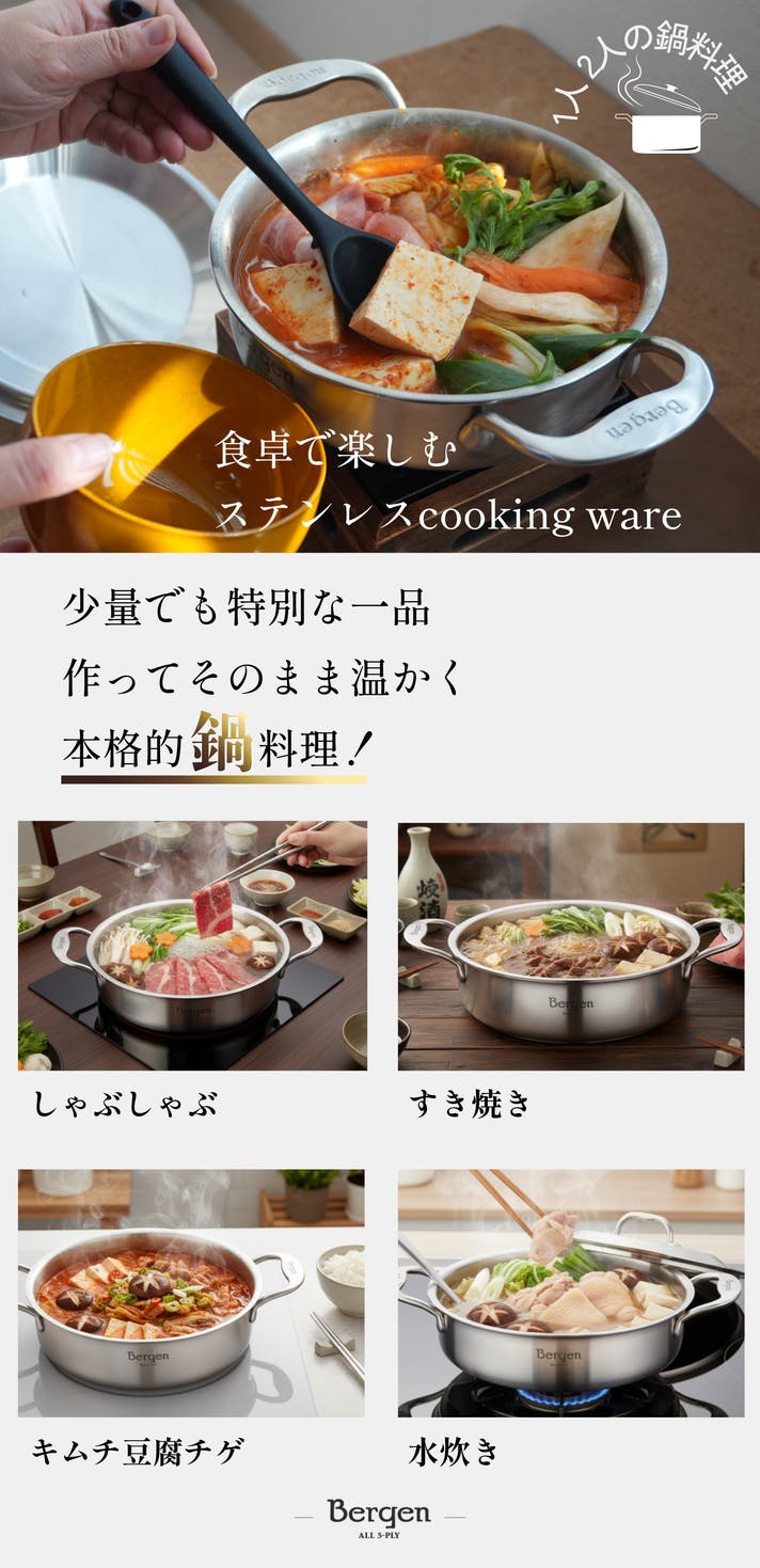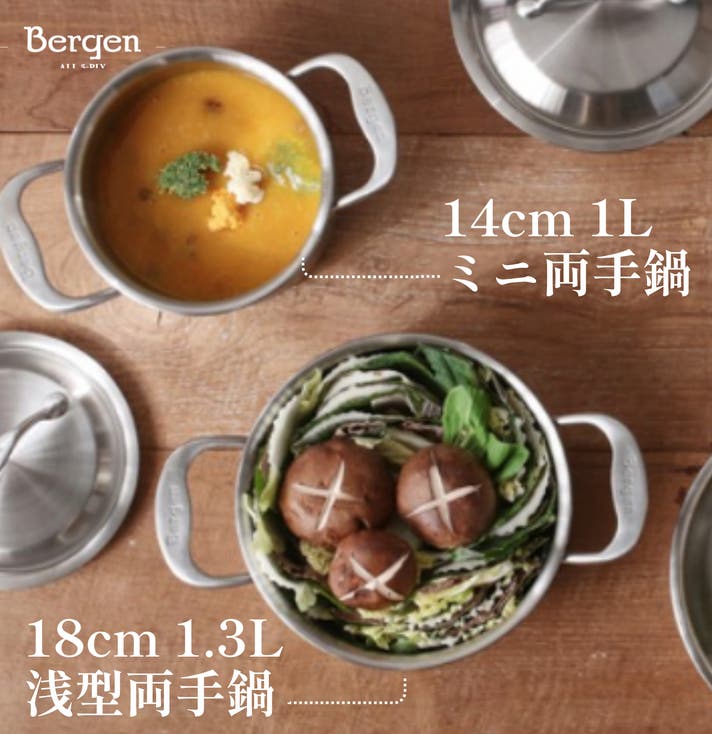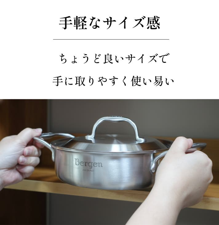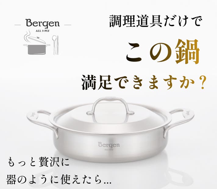 Bergenは見た目は小さく「器の大きい」両手鍋です。炊く、煮る、焼くまでこなす本格的5層ステンレス調理アイテムです。
