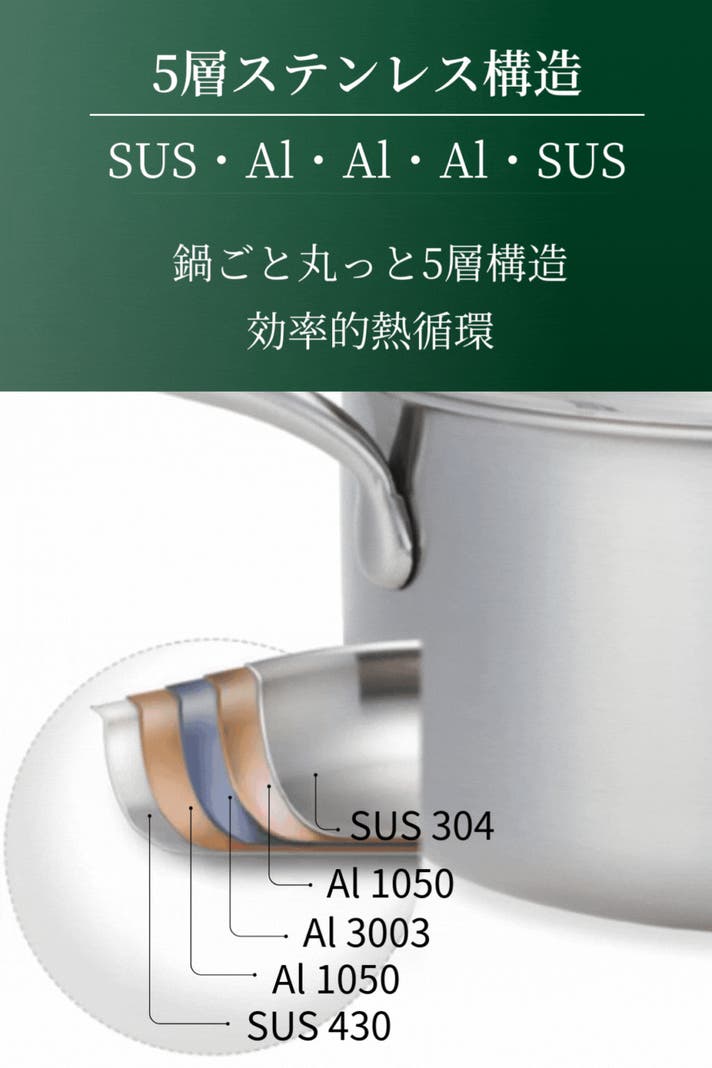 5層構造のうち中間層の3つはアルミ素材を採用しています。これにより熱伝導率を高め、早く熱を伝え内外からステンレスで挟み込むことで保温、保冷効果も生まれるのです。ステンレスは製造工程にある加工硬化という現象により、一度加工すると次の加工がしにくくなる特徴を持つとても強度の高い金属です。