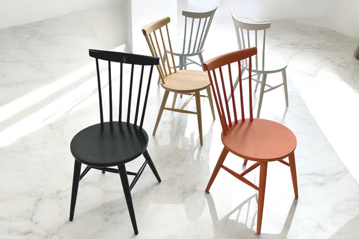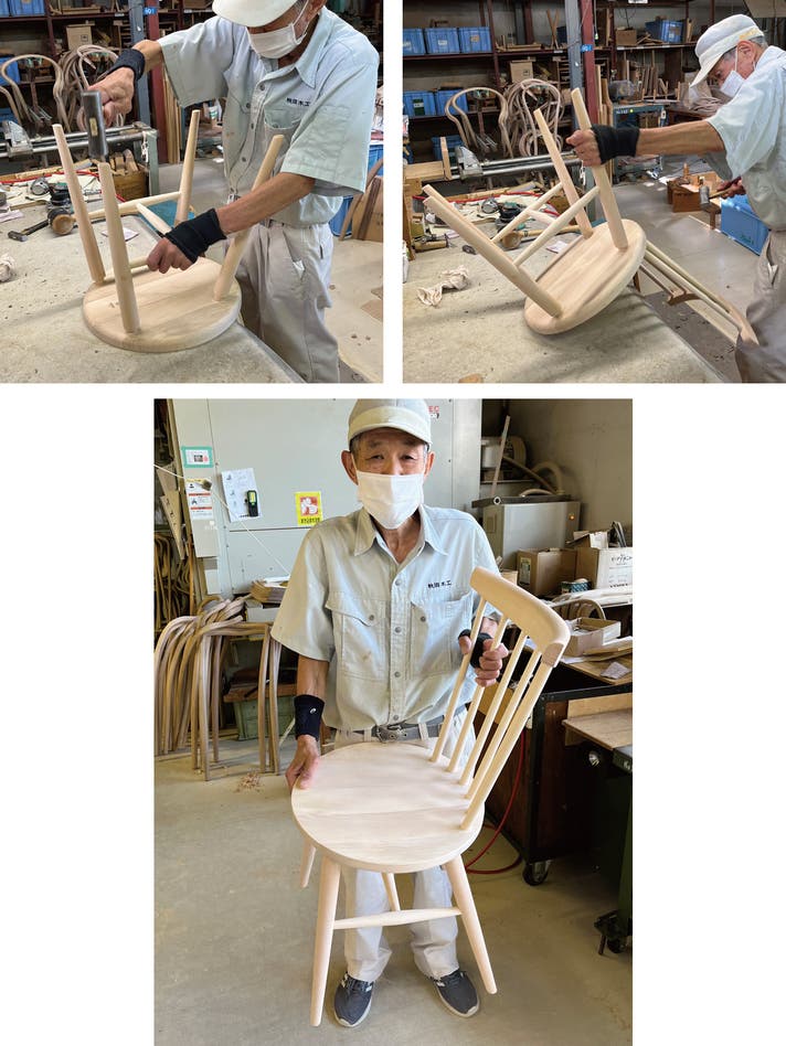 - 秋田木工の無垢材曲木の職人技。背中を受け止める曲線で座り心地のよさを体験してほしい。