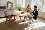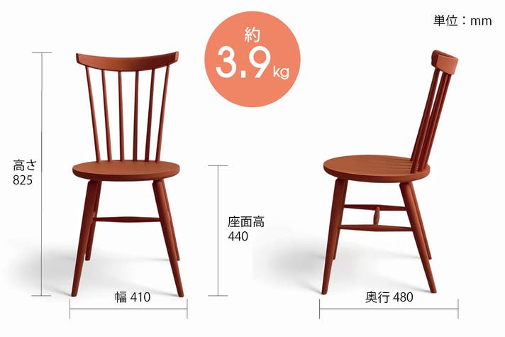 この椅子も曲木の技術を用いており、ブナ材特有の軽さと曲木の丈夫さ、幅の広い安定した座面で老若男女問わず人気な商品です。