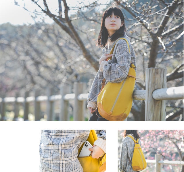 持ち手や底など経年で使用感が出やすい部分、ベルトの長さ調整部分、タブなど負荷のかかる部分には、経年で味わい深く変化し強度も高い革を使用し、体に密着するバッグ本体、ベルトの肩に接する部分にはやわらかい帆布を使用しています。