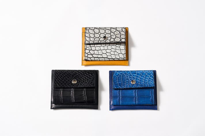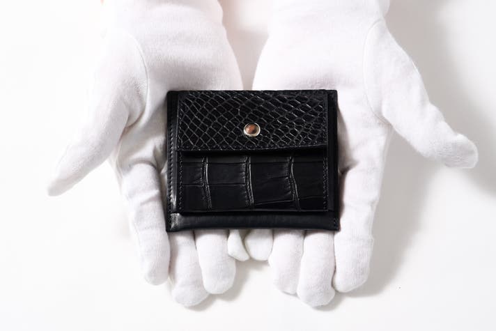 ② コンパクト財布(mini-wallet) 30g 手のひらに収まるスリムな財布。お札入れ・小銭入れ・カードポケットを備えながら、わずか30gの軽さを実現。クロコダイルのコインケースとのバランスが美しい、上品なコンパクト財布です。